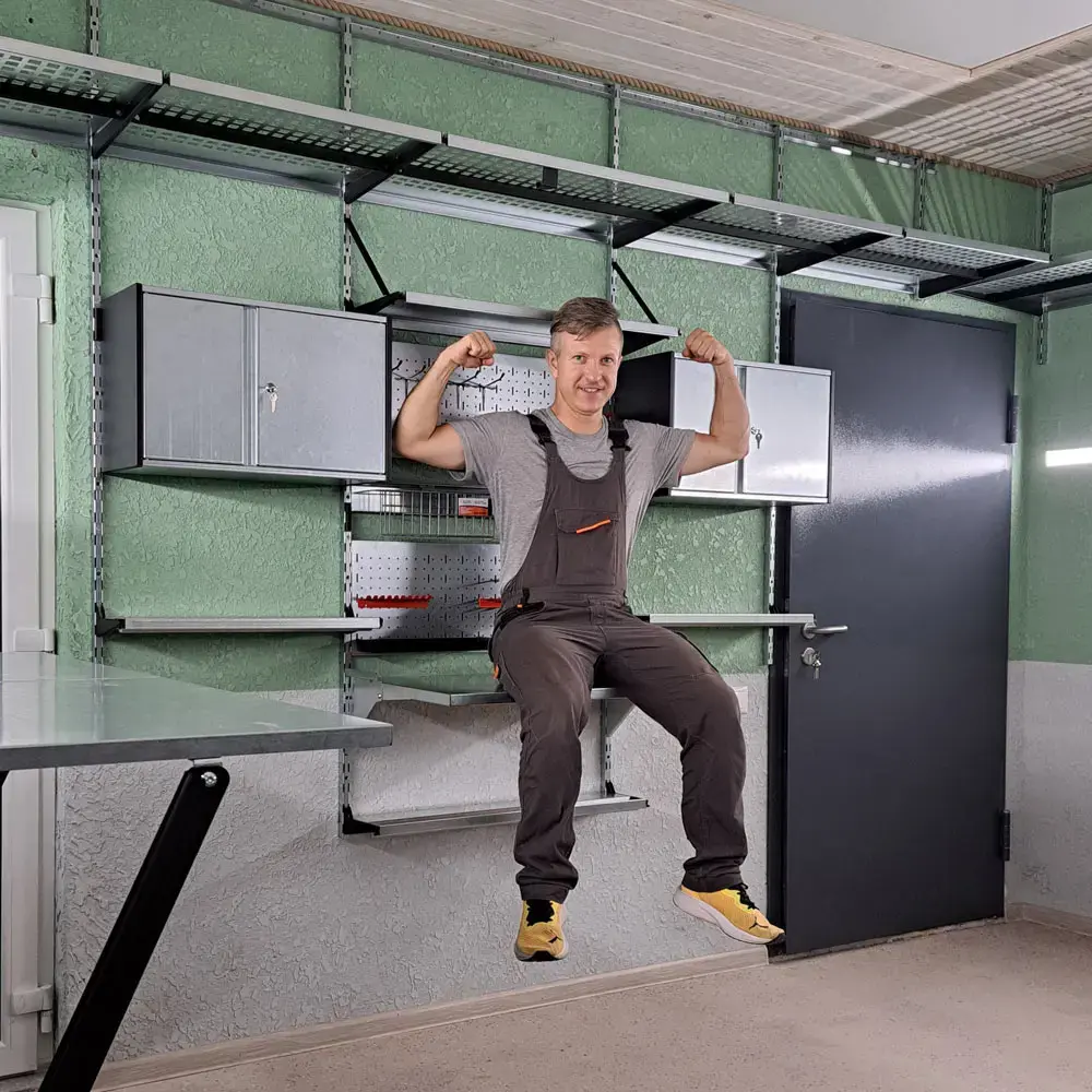 Складной верстак модульной настенной системы хранения IF предлагает удобное и эффективное решение для организации рабочего пространства которое поможет сэкономить пространство в гараже или мастерской.