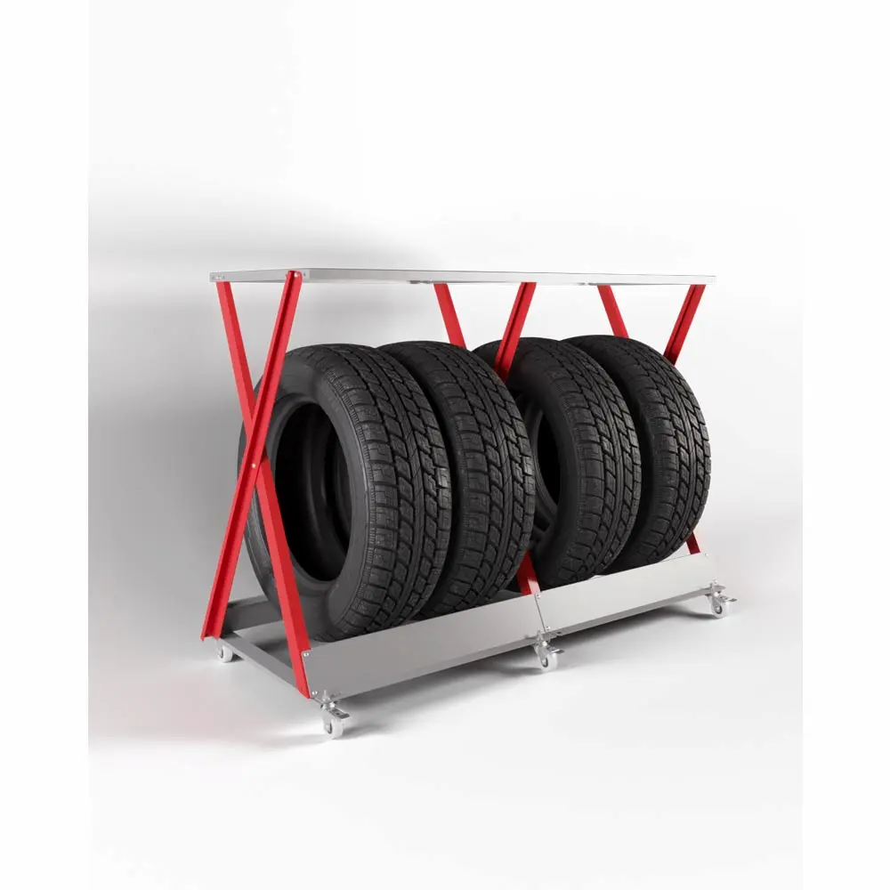 Стеллаж обеспечивает удобное и безопасное хранение колес. Каждое колесо лежит на двух покатых опорах для шин, что предотвращает деформацию покрышек. Кроме того, стойка выдерживает значительные нагрузки благодаря системе перекрестного соединения, что делает ее устойчивой даже без крепления к полу.
