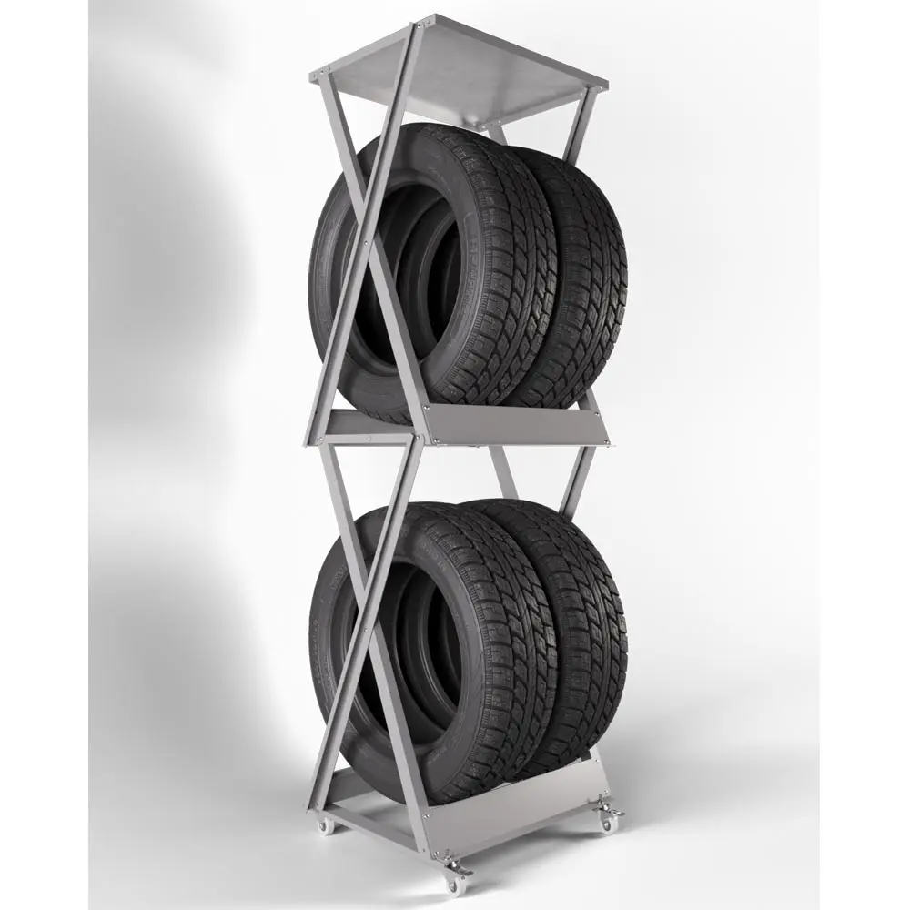 Стеллаж обеспечивает удобное и безопасное хранение шин. Каждая шина лежит на двух покатых опорах, что предотвращает деформацию покрышек. Кроме того, стойка выдерживает значительные нагрузки благодаря системе перекрестного соединения, что делает ее устойчивой даже без крепления к полу.